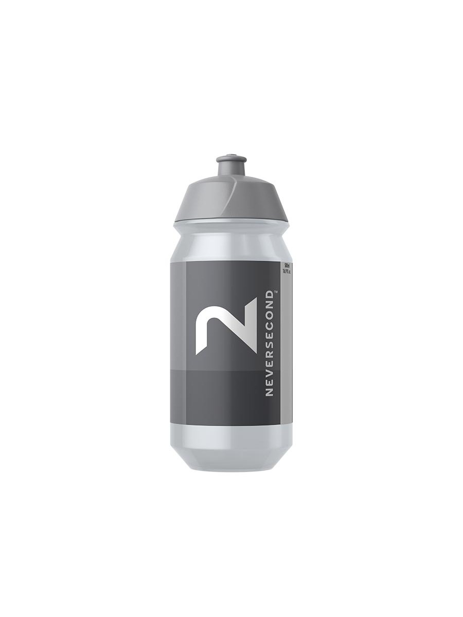Przejrzysty, solidny bidon z czterokolorowym wzorem i logo Neversecond.