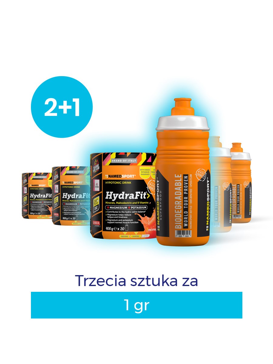 HydraFit> od NAMEDSPORT> to napój hipotoniczny w proszku do rozpuszczenia w wodzie. Dobrze nawadnia organizm w trakcie oraz po wysiłku fizycznym, jednocześnie uzupełniając węglowodany i składniki mineralne.